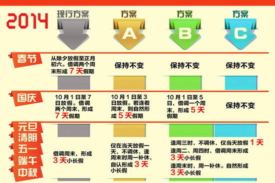 假日辦征求對假期意見,三種方案拿出來征求民意,用哪個都會招來吐沫。其實這也不是眾口難調,而是管得太寬。一年放多少假,怎么個放法,把公務員給規定好了就結了。至于一般群眾想怎么休息,讓大家自行決定不好嗎?有那個絞盡腦汁琢磨挪日子的精力,真不如好好想想怎么落實勞動法,讓大家能踏實休息,踏實帶薪休假,踏實每周40小時工作制。瞧瞧古今中外,哪個國家、哪個朝代,有為放假這么嘬牙花子的么?